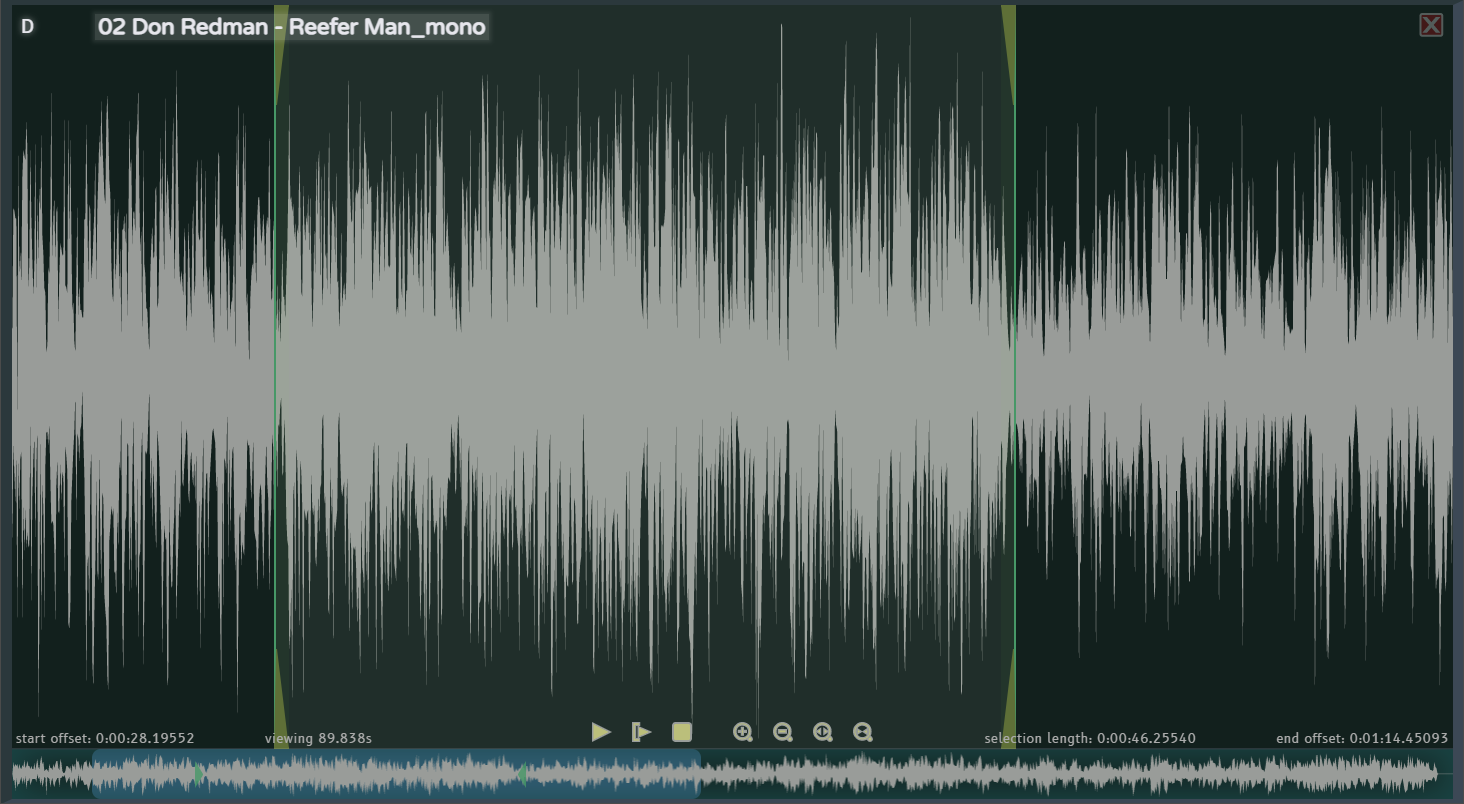 In zoom view, the small waveform along the bottom of the screen becomes a thumbnail for viewing the larger version of the waveform above. You can zoom in and out by using the mouse scroll wheel or by clicking the zoom buttons detailed below. Offset start and end points are represented by draggable boundaries positioned over the large waveform and duplicated underneath over the thumbnail waveform. When zoomed in, a scrollable slider appears over the thumbnail indicating the currently visible area of the large waveform section. Along the bottom, in addition to the start offset and end offset position values, the length in seconds of the current viewable area, and the total offset selection length are displayed; as with the displayed offset positions, these values are relative to the duration of the sound at its default normal speed and don't reflect any speed changes made with pitch shift. Note that very short sounds less than 1/4 second in length can not be zoomed into due to lack of enough waveform data to display. ▰ Click anywhere along the large waveform to start the sound playing from the clicked point, or, if the sound was already playing, to seek to that point; you can also play by pressing the keyboard key, or clicking the play buttons detailed below, and you can continue to trigger other sounds via the keyboard as normal while in 'zoom view'.